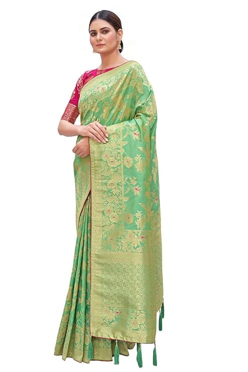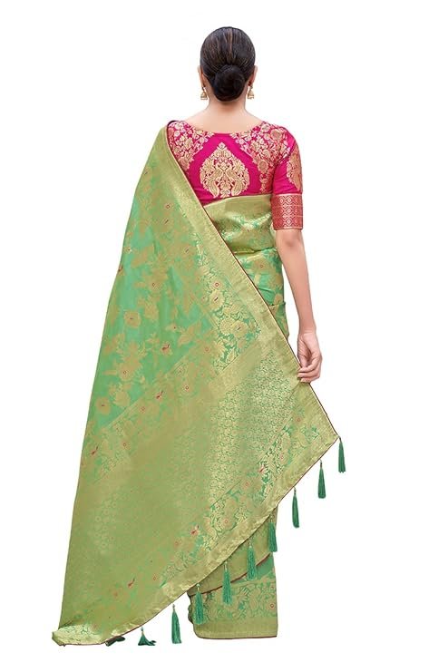 Monjolika Fashion | Women’s Banarasi Silk Blend Woven Zari Saree with Tassels & Jacquard Woven Blouse Piece | SV25090112